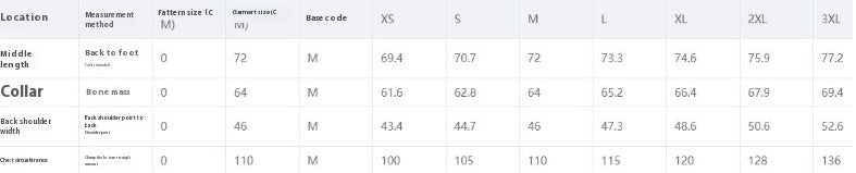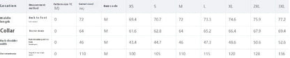 | Größe | Mittlere Länge (cm) | Kragen (cm) | Rücken Schulterbreite (cm) | Brustumfang (cm) |